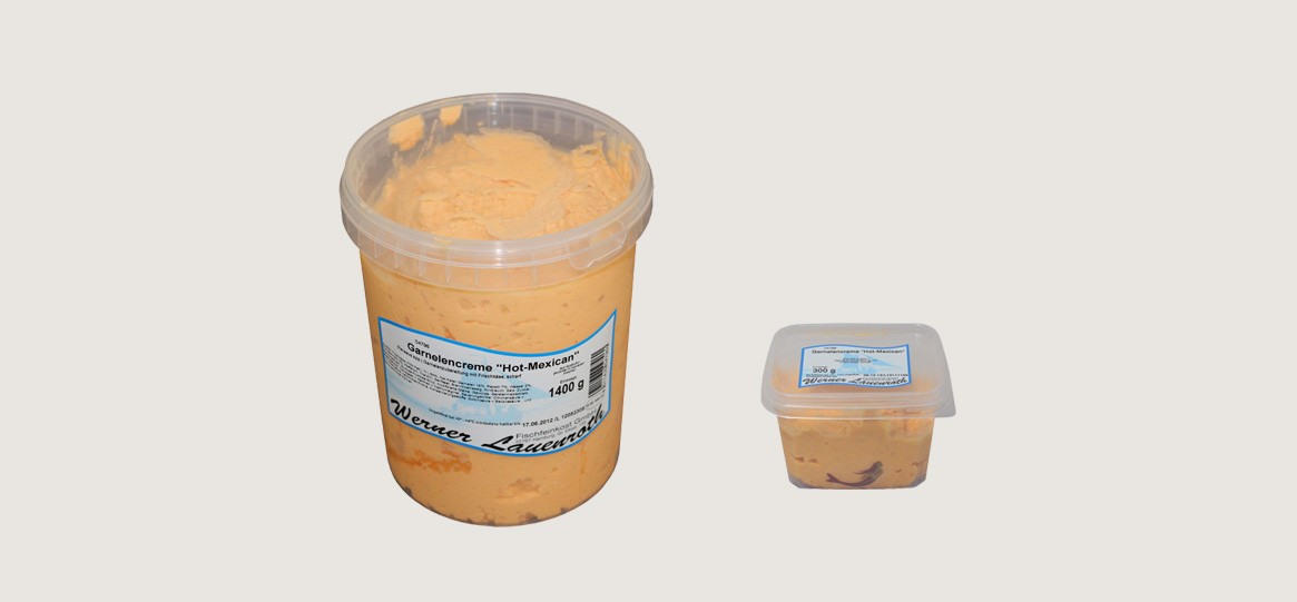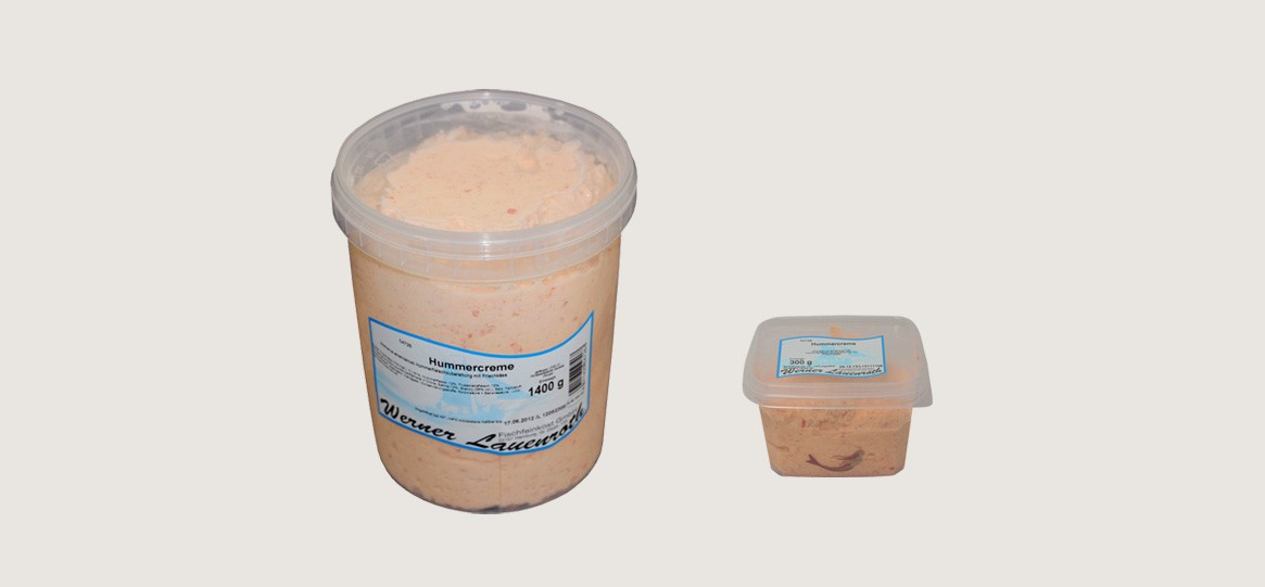 AufstricheSalateSaucen / DipsRund um den SalatKnabbereiSalate / Saucen / DipsAUFSTRICHE » Pikante aromatische AufstricheHummercreme » Rosafarbene Creme mit erlesenem Hummerfleisch 04726 - 1400g Topf, 04728 - 300g BecherRäucherlachscreme » Helle Creme mit Räucherlachs und Schnittlauch 04736 - 1400g Topf, 04738 - 300g BecherFlußkrebscreme Mediterrana » Flußkrebsfleisch mit Frischkäse zubereitet, mit einer würzig - mediterranen Note 04786 - 1400g Topf, 04788 - 300g BecherGarnelencreme Hot Mexican » Garnelenfleisch mit Frischkäse zubereitet, mit einer würzigen - scharfen Note 04796 - 1400g Topf, 04798 - 300g Becher