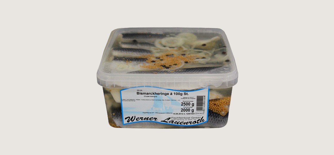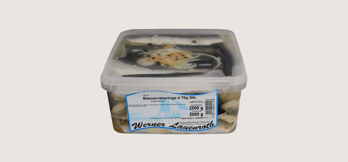 BismarckheringMarinierter MatjesMarinierter HeringSardellenMariniertesBISMARCKHERING » Bismarckhering in würziger MarinadeBismarckheringe 70g/Stück »Silbrig glänzende ganze Heringsfilet 05110 - á 70g St., 2500g SchaleBismarckheringe 100g/Stück »Silbrig glänzende ganze Heringsfilet 05100 - á 100g St., 2500g Schale, 05105 - 5kg EimerGabelmöpse 40g/Stück » Gabelmöpse in einer mild eingelegten Marinade 05230 - á 40g St., 2500g Schale