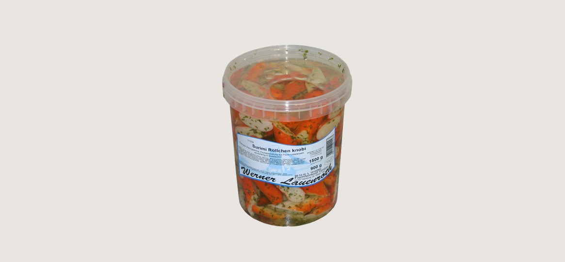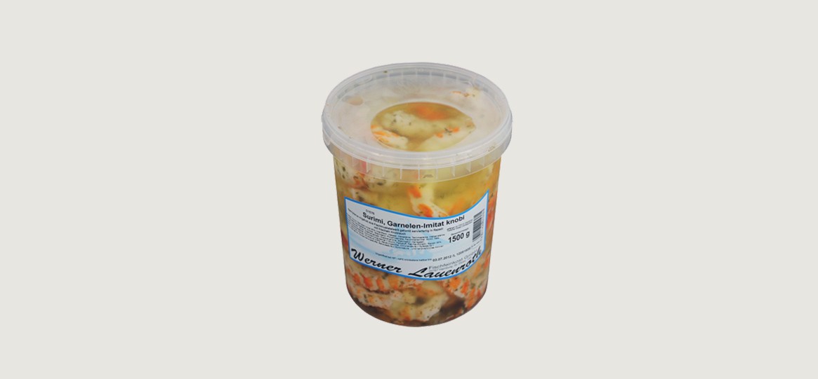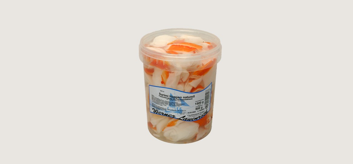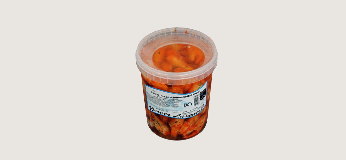 SurimiGarnelenFlusskrebsfleischMeeres / FrüchteFischMeeresfrüchteSURIMI » Surimi als Happen und als Röllchen mild und pikantSurimi-Happen naturell » Surimi Krebsfleisch in einer milden, harmonisch abgestimmten Lake 00516 - 1500g TopfSurimi-Röllchen Knobi » Surimi Krebsfleisch in aromatischem Knoblauchöl, kein Knoblauchgeruch nach dem Verzehr 01556 - 1500g Topf, 01558 - 340g BecherSurimi-Garnelen Knobi » Surimi Garnelen in aromatischem Knoblauchöl, kein Knoblauchgeruch nach dem Verzehr 01576 - 1500g Topf, 01578 - 340g BecherSurimi-Krebsscheren Knobi » Surimi Krebsscheren in aromatischem Knoblauchöl, kein Knoblauchgeruch nach dem Verzehr 01586 - 1500g Topf, 01588 - 340g Becher